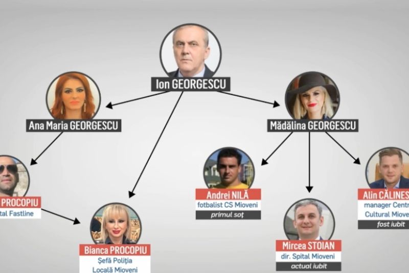 Flagrantul primarului din Mioveni scoate la iveală o imensă caracatiță din jurul conducerii orașului. În cei 17 ani de când conduce localitatea, Ion Georgescu a ajuns la rangul de baron local, cu legături la cel mai înalt nivel. Și-a pus ginerele șef la noul spital din Mioveni. Iar pe fiica sa, Mădălina, a numit-o șefă la filiala Argeș a Camerei de Comerț și Industrie dintre România și China.