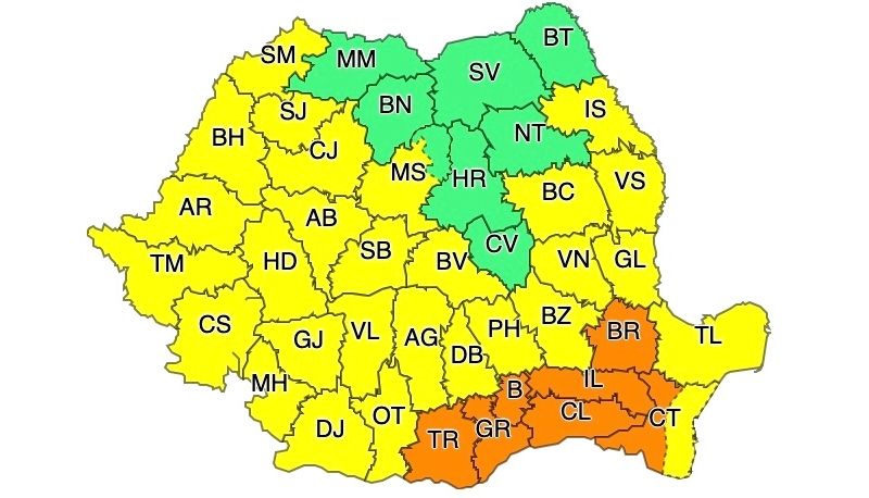În județele Teleorman, Giurgiu, Călărași, Ialomița, Brăila, Constanța, Ilfov și municipiul București valul de căldură și canicula se vor intensifica. Se vor înregistra temperaturi maxime de 37...39 de grade. Disconfortul termic va fi accentuat, iar indicele temperatură-umezeală (ITU) se va situa peste pragul critic de 80 de unități.