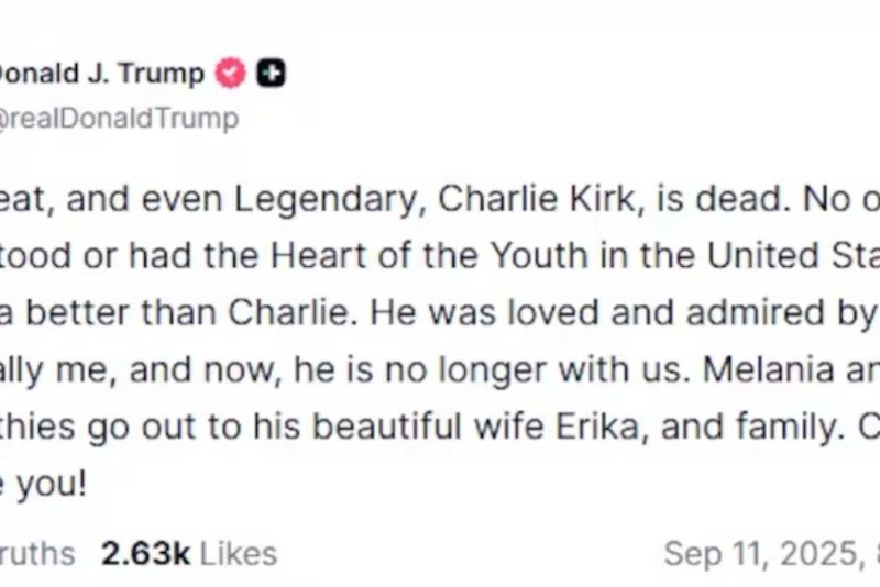 "Marele, și chiar Legendarul, Charlie Kirk este mort", a scris Trump pe Truth Social.